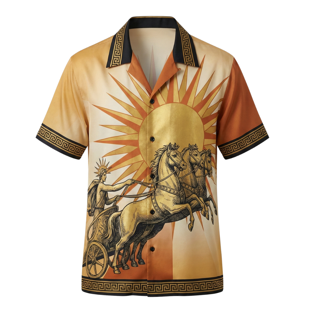 Son design s’inspire des fresques antiques : un char lancé vers l’horizon, des lignes solaires affirmées, une composition graphique forte mais parfaitement équilibrée. Les tons sable, ambre et or créent une profondeur lumineuse, presque vibrante, qui attire naturellement le regard.